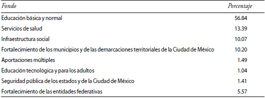 Entre 1998 y 2015, en promedio, el Ramo 33 creció 4.43 por ciento anual, mientras que el PIB creció 2.32 por ciento anual durante el mismo periodo. En 1998, el Ramo 33 representaba el 2.67 por ciento del PIB y, para 2015, había aumentado a 3.9 por ciento del PIB. La distribución de esos recursos, por fondo, se ilustra en el cuadro 1. Se puede observar que el área que más se beneficia de los fondos es la educación, pues concentra 57.88 por ciento del Ramo 33 (incluyendo educación básica, normal de maestros, educación tecnológica y para los adultos). La segunda área que más recursos obtiene son los servicios de salud, con 13.39 por ciento.1 Estas cifras muestran que el Ramo 33 está orientado principalmente a mejorar el desarrollo humano, pues se enfoca en la salud y la educación, dos componentes importantes del índice de desarrollo humano.
