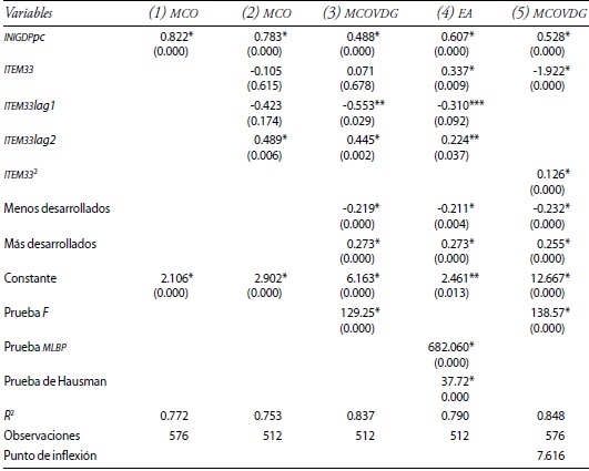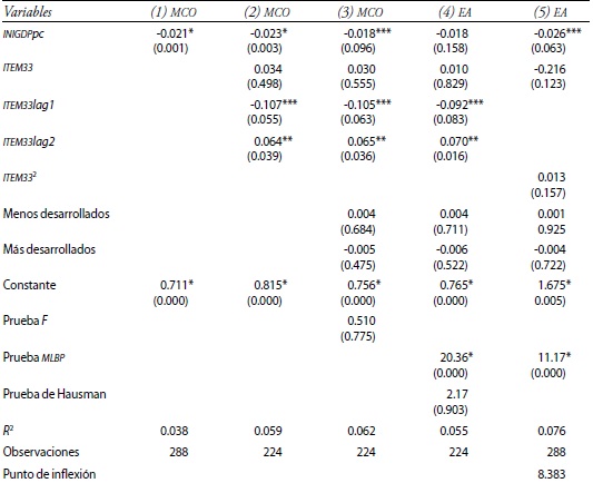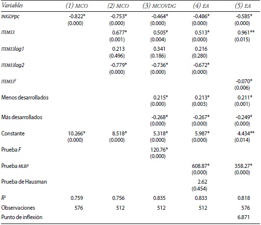 La regresión cuadrática toma forma en la ecuación (11); la especificación se elige según el resultado de la prueba de Hausman previa, y también reportamos la prueba correspondiente para contrastar el resultado con el modelo MCO.