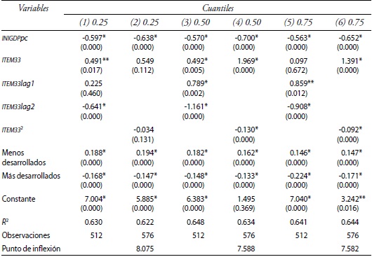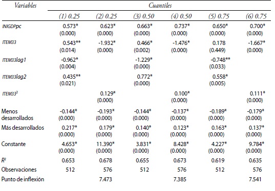 Las regresiones de cuantiles se reportan en el cuadro 5. Las especificaciones, tanto lineales como cuadráticas, muestran que el PIB per cápita inicial es negativo; el Ramo 33 en niveles y con un rezago tiende a ser positivo, mientras que el segundo rezago es negativo; y las dummies regionales para estados menos desarrollado y más desarrollados tienen signo positivo y negativo respectivamente. Además, el término cuadrático es negativo, lo que confirma la presencia de un punto de inflexión máximo, y es consistente con el patrón de los rezagos del Ramo 33 en las especificaciones no cuadráticas. El resultado no diverge del análisis general y, por lo tanto, es evidencia de que nuestros resultados son robustos.