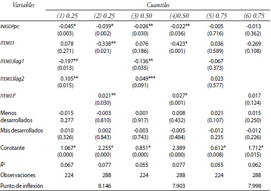 Las regresiones, tomando en cuenta la tres variables endógenas, se realizan para los cuantiles 0.25, 0.50 y 0.75, y los resultados se contrastan en tablas específicas con el resultado obtenido de la regresión de datos de panel seleccionado para cada ecuación.