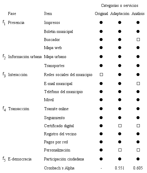 En línea con aquellas singularidades locales y en sintonía con las etapas identificadas por Fath-Allah et al. (2017) y los componentes del modelo evolutivo (véase Luna, 2017), Esteves (2005) elaboró un modelo que aplicó a los gobiernos locales españoles con 16 servicios digitales o e-servicios agrupados en cinco dimensiones. Este modelo ha sido adaptado para estudiar los municipios venezolanos y argentinos (Bayona y Morales, 2017; Gómez, 2007). Las cinco dimensiones representan diferentes fases de madurez digital del ciclo de desarrollo del gobierno electrónico local: a) presencia, fase en la cual los servicios tienen la capacidad de proveer información sobre su acción al ciudadano, es decir, existe información en línea y la incorporación de esquemas de búsqueda básica, b) información urbana, donde se provee información como el mapa comunal y el transporte urbano, c) interacción, fase que considera comunicaciones simples entre el municipio y el ciudadano, donde el contacto se suele realizar por diferentes vías,3d) transacción, que incluye interacción electrónica bidireccional para, por ejemplo, realizar pagos y procesar formularios complejos, entre otras actividades y e) e-democracia, fase que incluye servicios de participación ciudadana como, por ejemplo, foros de conversación sobre temas de interés local.