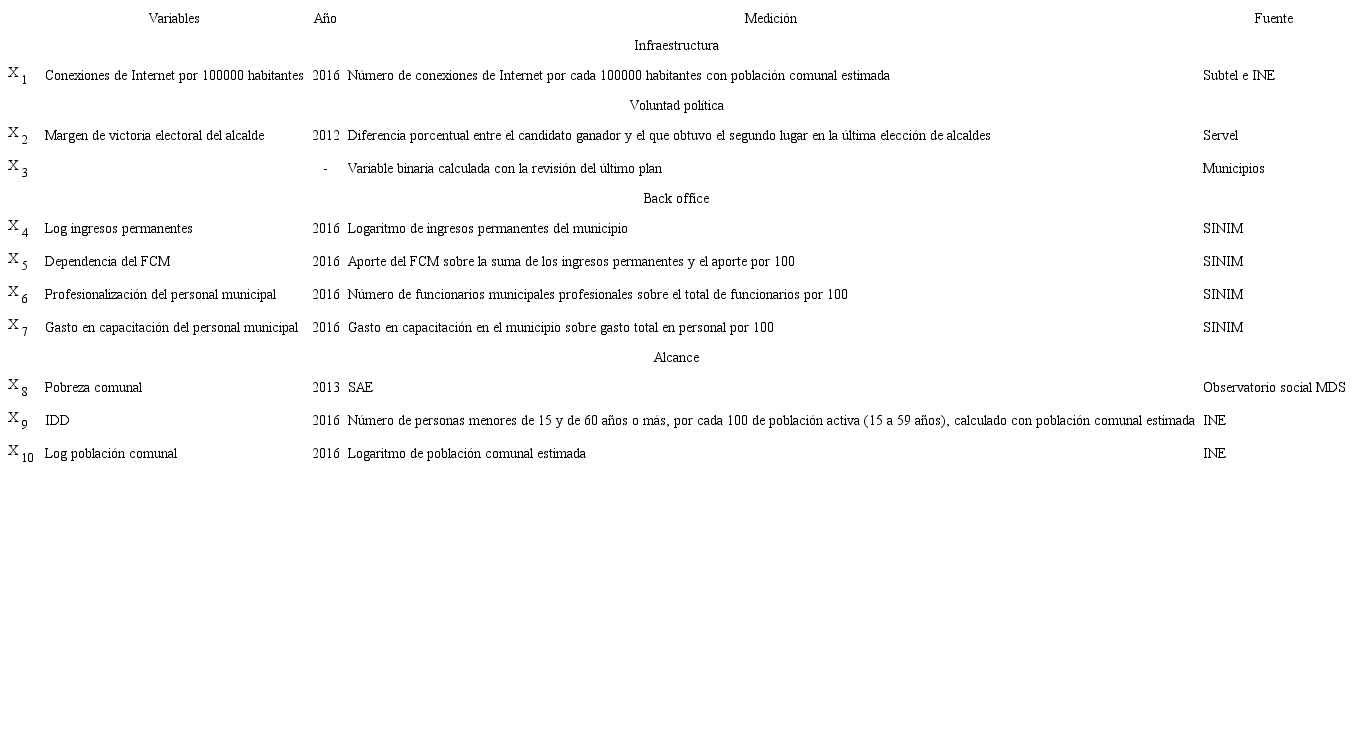 Las variables independientes se operacionalizan con datos e información de las siguientes instituciones: a) INE, b) Observatorio Social del MDS, c) Subsecretaría de Telecomunicaciones, (Subtel), d) Servicio Electoral (Servel) y e) Sistema de Información Municipal (Sinim), dependiente de la Subdere. También se utiliza información proveniente de documentos de los municipios, como el Pladeco. Las variables se tipifican usando logaritmos y tasas para una interpretación adecuada de los modelos econométricos.