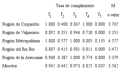 El puntaje máximo alcanzado por los municipios evaluados corresponde a Las Condes, perteneciente a la Región Metropolitana de Santiago, con 7.75 puntos, de un total posible de 8.50 puntos con el modelo adaptado. Luego siguen Lo Barnechea y Providencia, ambos también pertenecientes a la Región Metropolitana, con 7.25 puntos cada uno. Con respecto a las tasas de cumplimiento, en general las más altas las presenta f1 (presencia) y luego f3 (interacción). Resulta llamativo que en todas las regiones f3 (interacción) y f4 (transacción) superen a f2 (información urbana). El alto desarrollo de f4 se puede explicar tentativamente por el auge de trámites en línea durante la última década, entre ellos, el pago de patentes de circulación vehicular y cobros por aseo y limpieza urbana.