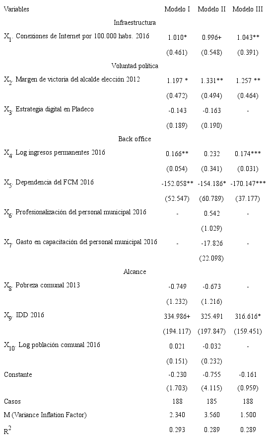 El análisis con regresiones, por otra parte, busca identificar predictores para el desempeño del gobierno electrónico en las municipalidades chilenas. Para esto se usan tres regresiones lineales (Ordinary Least Square, en adelante OLS) que evalúan el impacto de variables que subyacen en las dimensiones teóricamente necesarias para la implementación exitosa de estrategias de gobierno electrónico y que también están asociadas teóricamente al éxito del gobierno electrónico municipal. Para todos los modelos se realizan pruebas de multicolinealidad, se evalúa la homocedasticidad y el cumplimiento de todos los supuestos de aplicación de las regresiones lineales (Weisberg, 2013; véanse también Draper y Smith, 1998; Wooldridge, 2013).