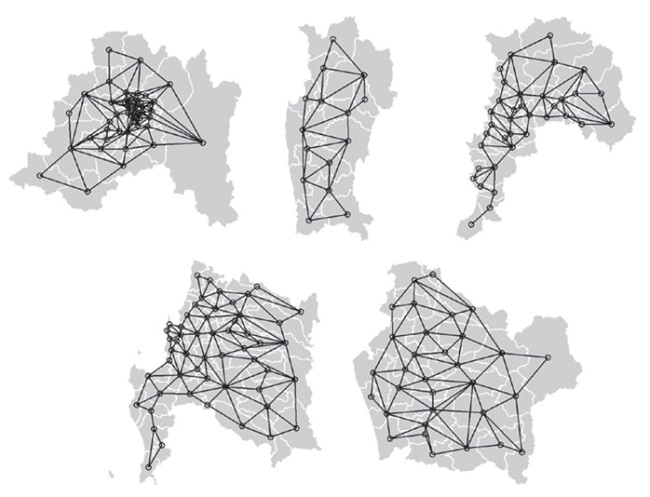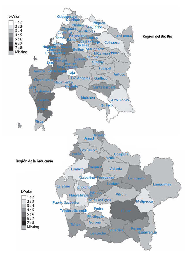 El índice e-valor en las regiones de Coquimbo, de Valparaíso, del Bío Bío y de la Araucanía se distribuye sin patrones claramente identificables con una inspección visual. Al calcular Moran-I bajo aleatorización y con simulaciones MCMC, sólo la Región Metropolitana tiene un patrón de configuración espacial estadísticamente significativo con un nivel de confianza de 95 por ciento (p = 0.037; p = 0.044). Se verifica una autocorrelación espacial positiva en la zona nororiente, sobre todo en comunas con alto nivel de ingresos, donde se identifica un pequeño clúster de municipios con elevado índice e-valor (Moran-I = 0.123; MCMC = 0.123). Por otra parte, con 90 por ciento de confianza, en la Región de Valparaíso (p = 0.061; p = 0.067) y del Bío Bío (p = 0.084; p = 0.091) no se logran identificar patrones estadísticamente significativos, aunque se aprecia una leve tendencia de asociación y agrupación entre valores elevados del índice e-valor con capitales regionales y ciudades de mayor nivel de urbanización y densidad demográfica.