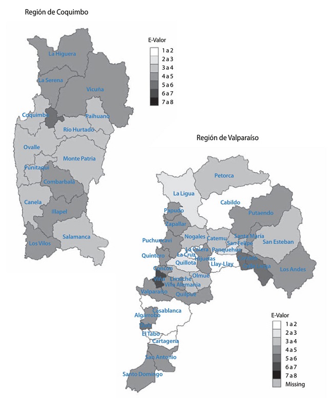 Por otra parte, la Región Metropolitana es la que presenta el e-valor promedio más alto, seguida por la Región de Coquimbo. En la Región Metropolitana, específicamente, es posible apreciar cómo los municipios con índice e-valor más alto son aquellos que se ubican en la zona nororiente, los que corresponden a comunas con bajas tasas de pobreza y un alto nivel de desarrollo humano.