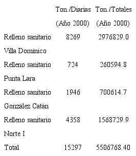 Para los inicios del periodo de estudio de esta investigación, es decir, el año 2000, la RMBA generaba un promedio de 15 297 toneladas de residuos por día que eran repartidos de la siguiente manera entre los cuatro rellenos sanitarios activos de la región: 8 269 ton./diarias se disponían en Villa Domínico, 724 ton./diarias en el relleno de Punta Lara, 1 946 ton./diarias en el relleno de González Catán y 4 358 ton./diarias en Norte III (cuadro 1). Si miramos los datos anuales de disposición que aparecen en el cuadro mencionado, la RMBA dispuso un total de 5 506 768.40 toneladas de residuos en los rellenos sanitarios de CEAMSE durante todo el año 2000. Esto implicó que se enterraran durante el año 2000 un total de 2 976 829 toneladas en el relleno de Villa Domínico; 260 594.8 toneladas en el relleno de Punta Lara; 700 614.7 toneladas en el relleno de González Catán y 1 568 729.9 toneladas en el relleno de Norte III.