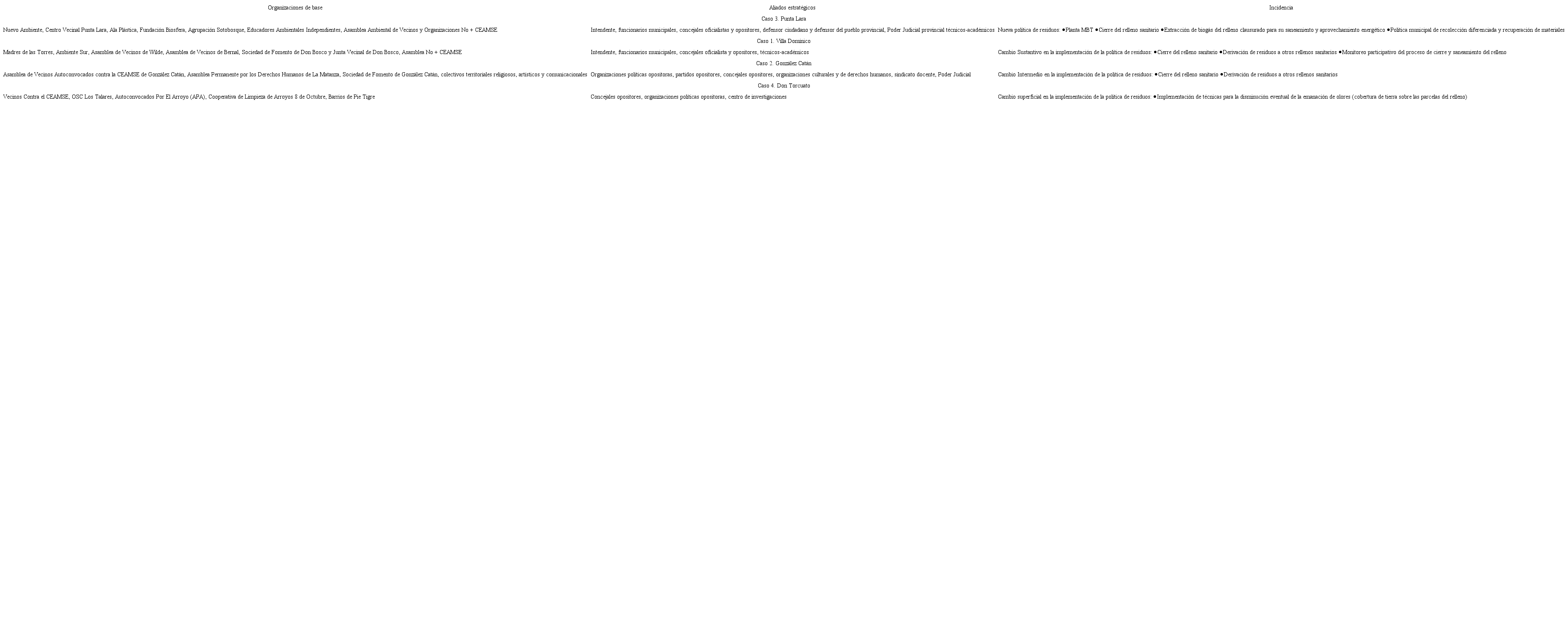 En este caso, las organizaciones de base que se posicionaron en contra de CEAMSE reclamando su cierre fueron principalmente organizaciones barriales y ambientalistas de la zona. Una de las organizaciones más activas en esta demanda fue un colectivo que surgió específicamente con este reclamo, Vecinos Contra el CEAMSE, que logró vincularse con otras organizaciones territoriales como la OSC ambientalista y local Los Talares, Autoconvocados Por El Arroyo (APA), la Cooperativa de Limpieza de Arroyos 8 de Octubre y la agrupación social Barrios de Pie Tigre. Entre los actores técnicos con los que se vincularon estas organizaciones de base estuvo un pequeño centro de investigación social llamado Instituto de Investigación Social, Económica y Política Ciudadana (Isepci) vinculado a la agrupación social Barrios de Pie y Libres del Sur.