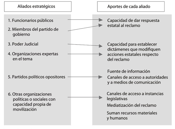 Los miembros del gobierno (empleados o funcionarios) y los miembros del partido de gobierno son aliados estratégicos debido a su posibilidad directa de concretar total o parcialmente los resultados estatales que reclama la organización movilizada, así como también de exigirlos desde dentro del Estado. El Poder Judicial, por su parte, es un actor con potestad legal para ordenar a los actores del Poder Ejecutivo que modifiquen sus políticas en caso de que se comprueben irregularidades en su implementación. Otras organizaciones formalizadas y reconocidas son aliados estratégicos porque pueden proveer de información valiosa para definir o denunciar un problema y, por práctica y conocimiento, pueden también abrir canales de acceso a autoridades y a medios de comunicación. Los partidos políticos opositores con capacidad de contestar legislativa o electoralmente al gobierno de turno pueden proveer canales de acceso a instancias legislativas o generar una mayor mediatización de las demandas de la organización movilizada. Cualquier otro tipo de organización o actor aliado puede proveer a la organización movilizada con recursos en términos de capital humano, infraestructura o logística que, si bien no abren directamente el acceso al Estado, pueden favorecer a la organización de forma indirecta.