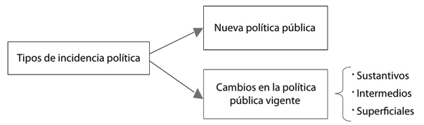 Burstein et al. (1995) han dejado claro que existen diversas formas de incidencia política. Los actores pueden incidir tanto promocionando cambios en torno a las políticas públicas actuales como impulsando políticas nuevas. El diagrama 2 muestra una clasificación tipológica propia que establece una serie de posibles tipos de incidencia en las políticas públicas.