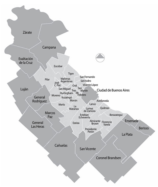 La RMBA está conformada por la Ciudad Autónoma de Buenos Aires, centro político y económico de la República Argentina, y por cuarenta municipios que la circundan.2 En el mapa 1 se pueden observar los distintos distritos que componen esta región.