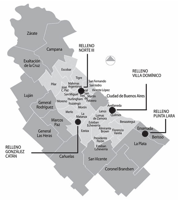 Los residuos de la RMBA se entierran en predios especialmente preparados e impermeabilizados para su disposición final denominados “rellenos sanitarios”, los cuales están ubicados en distintos puntos periféricos a lo largo de la región. Al inicio del periodo de estudio, en el año 2000, existían cuatro rellenos sanitarios activos donde se derivaban todos los desechos de la RMBA: Villa Domínico, Punta Lara, González Catán y Norte III cuya ubicación puede observarse en el mapa 2. Uno de estos rellenos, el de Villa Domínico, fue cerrado en el año 2004 a partir de los reclamos de organizaciones de base que pedían su cierre.