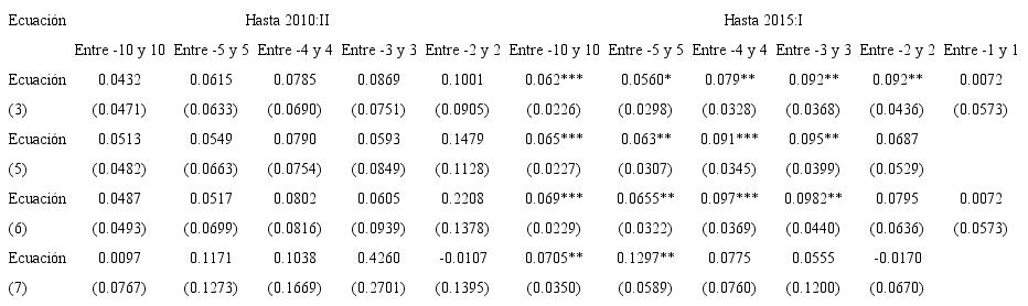 Los resultados de la evaluación empleando las cuatro ecuaciones (3, 5, 6 y 7), las mismas covariables y los seis anchos de banda incluyendo los inscritos hasta 2010:II se registran en los cuatro paneles del cuadro 9 (de manera similar a como se presentó en el cuadro 6). Las gráficas de discontinuidad se presentan en el Anexo 4.