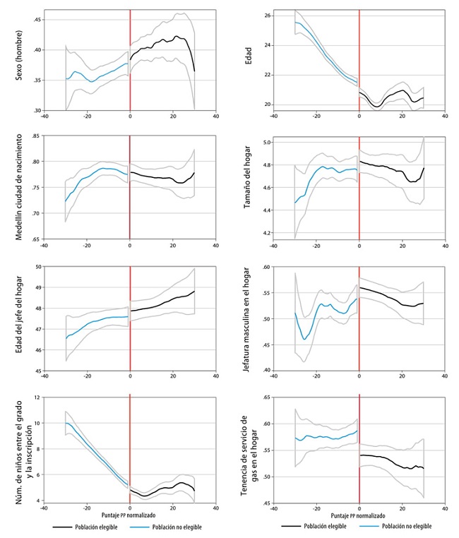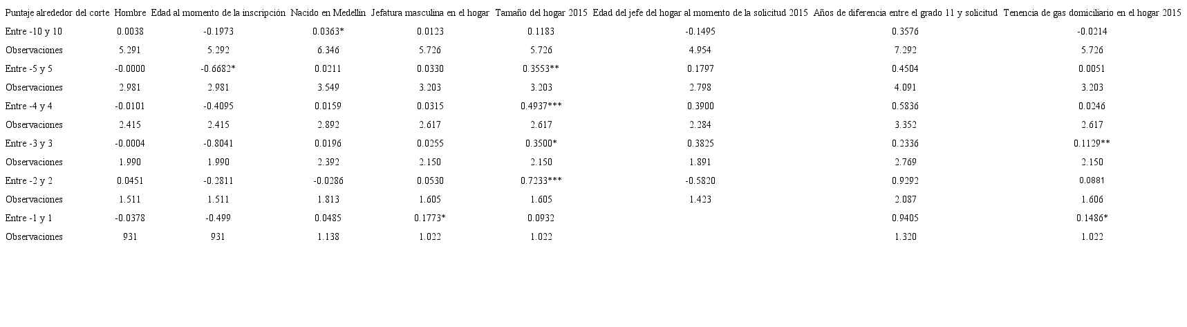 Se emplearon estas características primero porque no inciden o no tienen peso en el cálculo del puntaje de elegibilidad de acuerdo con la regla de selección de beneficiarios de Sapiencia y segundo, se hace el supuesto de que estas características son relativamente constantes en el tiempo. Esto significa por un lado que se asume por ejemplo que la jefatura del hogar no ha cambiado. Para el caso del tamaño del hogar, al analizar algunas estadísticas para la población sisbenizada de Medellín se puede mencionar que el promedio se ubica entre 4.7 y 5 personas, valor que no muestra mayor varianza. No obstante, de acuerdo con las regresiones del Anexo 2 el tamaño del hogar sí muestra discontinuidad, al igual que la tenencia del servicio de gas.