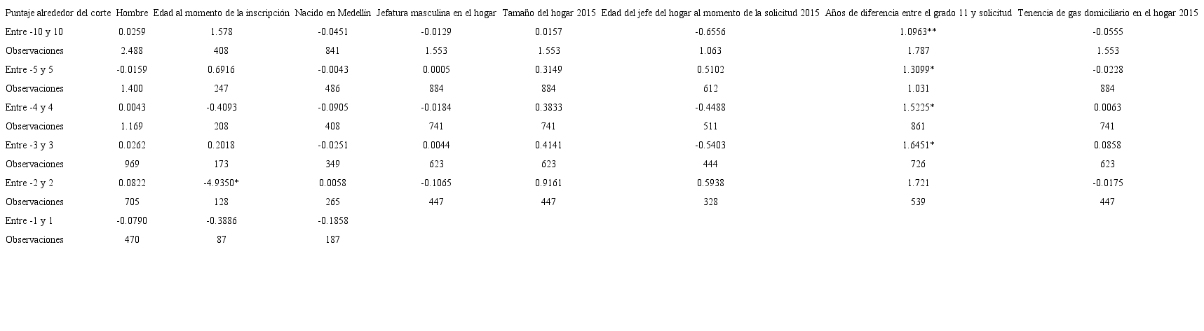 Esta condición se prueba estimando una ecuación lineal por mínimos cuadrados para cada covariable seleccionada controlando por la variable de tratamiento (D) y para diferentes tamaños de muestra alrededor del puntaje de corte. En estas regresiones también se incluyeron efectos fijos de comuna o corregimiento (C) equivalentes a variables binarias. En este sentido, las ecuaciones lineales a estimar igualmente por MCO con errores estándar robustos siguen la siguiente forma funcional: