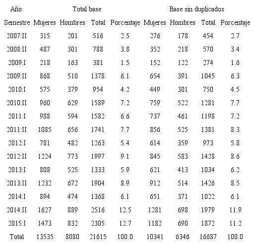 Inscritos al Programa de PLyPP. Datos de la Agencia Sapiencia con información de las personas que se inscribieron en cada convocatoria. Se tiene un total de 21 615 inscripciones entre 2007:II y 2015:I (2008:I no disponible). De estos registros, hay 3 480 repetidos (aquellos que se inscribieron más de una vez al programa). Se decidió mantener sólo la información del último registro debido a que, de acuerdo con la metodología de selección, el programa ni premia ni castiga por el número de aplicaciones y no es de esperar una mayor probabilidad de elegibilidad para quienes se presentan más de una vez,7 por lo que finalmente hay 18 135 observaciones. Adicionalmente, 1 448 inscritos se encuentran catalogados como no elegibles, pero tienen un puntaje superior al de corte.8 Éstos también son excluidos de la muestra, quedando al final 16 687 registros. La distribución de la población inscrita a PLyPP se sintetiza en el cuadro 2. Se identifica que para todas las convocatorias se han presentado más mujeres que hombres y que en los últimos periodos las inscripciones aumentaron.