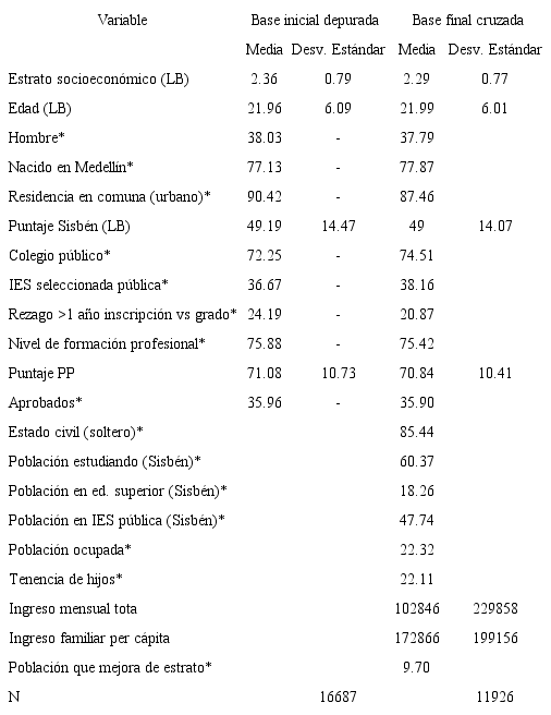 De la base de inscritos se seleccionó la edad al momento de la inscripción o postulación al programa, el sexo (uno es hombre) y si es nacido en Medellín u otra ciudad (uno si nació en Medellín) del aspirante como características socio-demográficas iniciales. De la base del Sisbén de 2015 se calculó el tamaño del hogar (de acuerdo con la variable clave que es ficha, hogar y orden de la persona), sexo (hombre) y edad del jefe del hogar al momento de la inscripción al programa y tenencia de servicio de gas en el hogar.