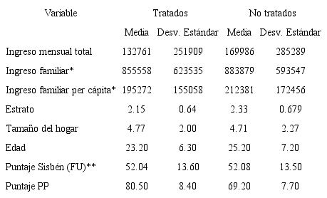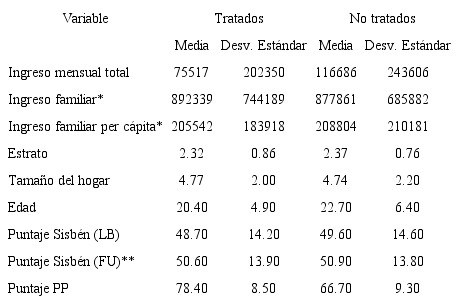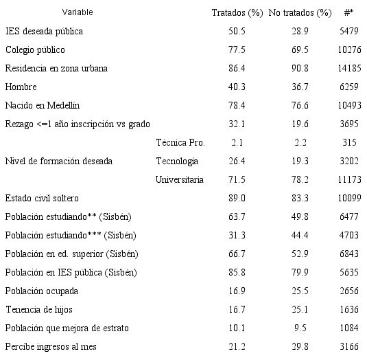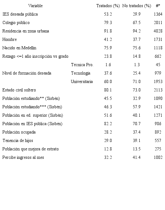 Los porcentajes del cuadro 4 indican, como es de esperarse, que en los determinantes del puntaje del programa (la variable de elegibilidad) la población tratada registra un favorable o mayor valor frente a la no tratada: colegio público, tiempo transcurrido no mayor a un año entre la fecha de graduación de bachillerato y la presentación a la convocatoria, e IES pública deseada por ejemplo, características que le otorgan al aspirante una mayor calificación (que para elegibles es obviamente superior: 78.4 vs 66.7) . Con respecto al puntaje del Sisbén en línea base, esto es, al momento de la inscripción al programa, hay coherencia con que el puntaje promedio para la población tratada sea inferior; lo mismo para el caso del estrato, aunque la diferencia no es estadísticamente significativa como sucede también con la condición de jefe de hogar, la cual no supera 10 por ciento.