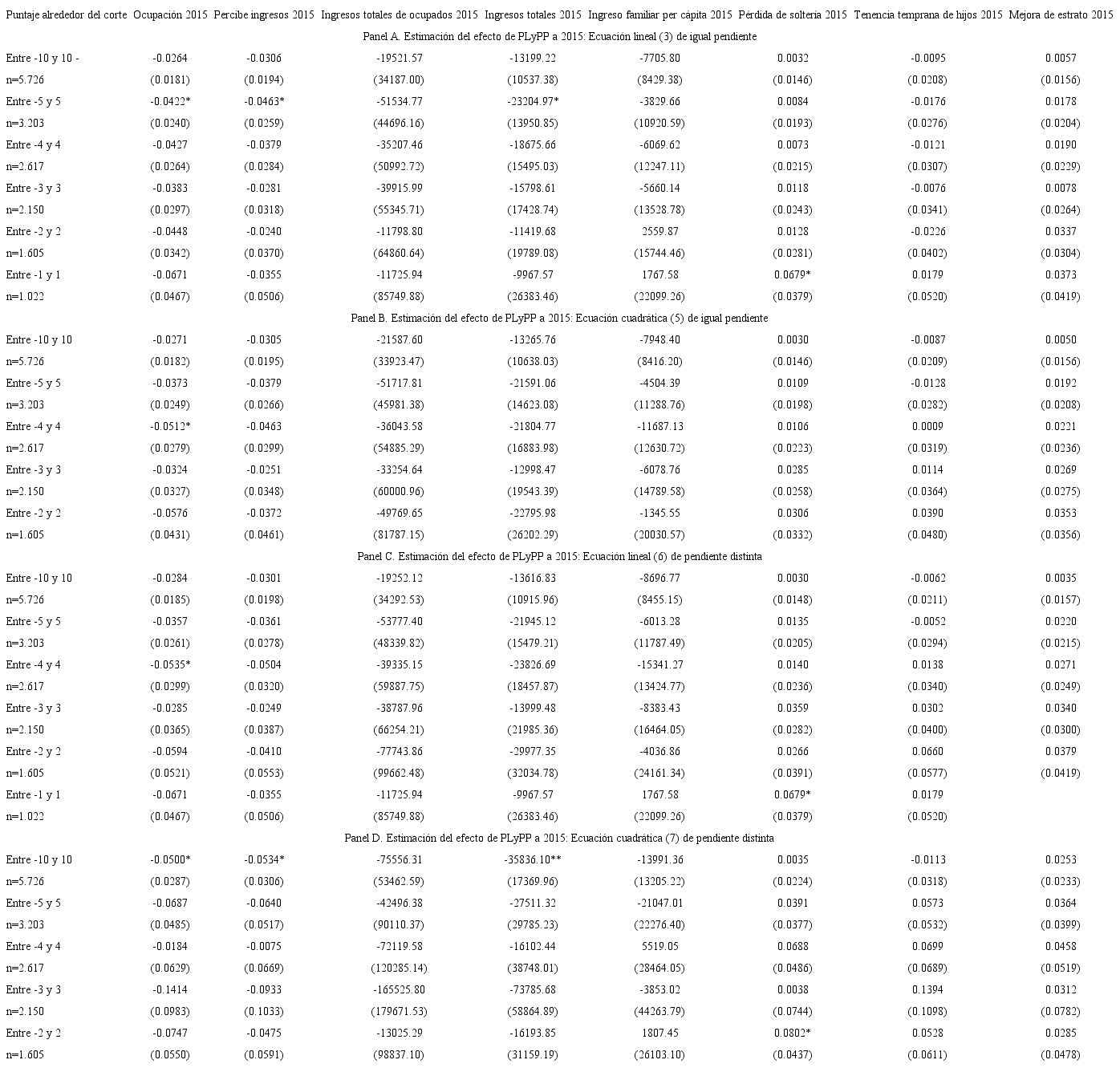Los outcomes se controlan con las covariables ya indicadas, la variable de asignación (normalizada), la dummy de tratamiento (D) y los efectos fijos de territorio, considerando las observaciones de todos los inscritos que cruzaron con Sisbén 2015. Los resultados se sintetizan en los cuatro paneles del cuadro 6, en el cual se reporta para cada outcome la dirección del efecto, su valor y el tamaño muestral y se indica la significancia estadística del efecto para cada uno de los seis anchos de banda.