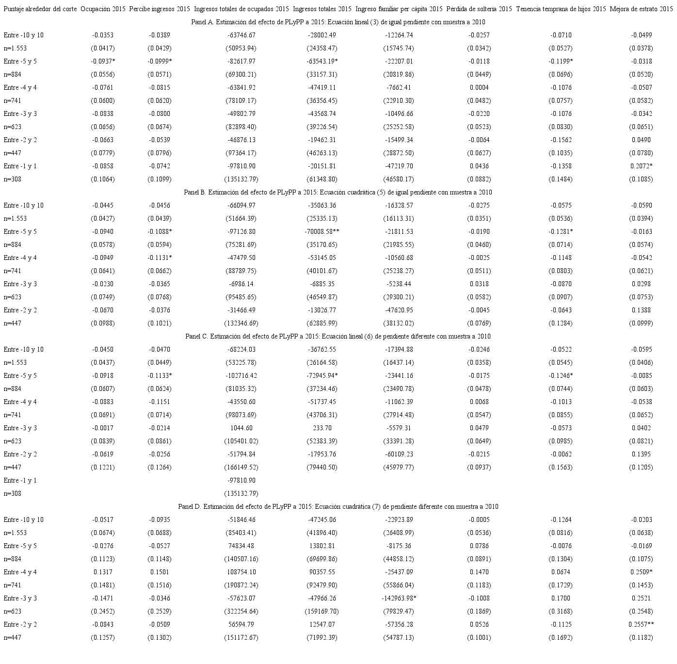 Finalmente, en mejora del estrato la mayoría de los coeficientes no son significativos, pero a partir de las ecuaciones (3) y (7) parece haber un efecto local del programa positivo cercano a 20 por ciento, lo que evidencia que PLyPP contribuiría a mejorar de estrato socioeconómico. Conviene mencionar que la variable mejora incluye tanto a los que pasaron del estrato 1 a 2 como a los que pasaron del 5 al 6 y el resto de posibilidades. Se hizo el ejercicio adicional de considerar para este último outcome no sólo la mejora sino el mantenerse en el estrato, con el fin de considerar también los casos en los cuales no se migra a una zona de menor estratificación. Si bien no se muestran los resultados, los coeficientes aunque tienen el signo positivo no hay significancia estadística.