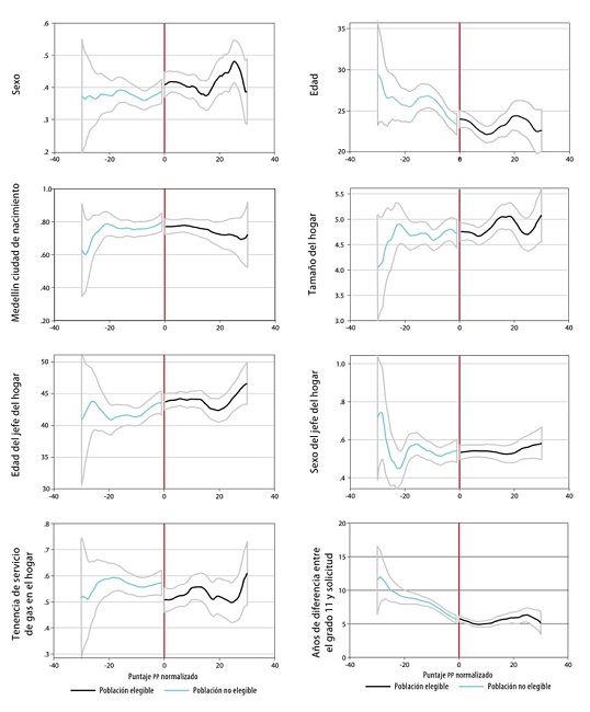 Adicionalmente a la discontinuidad en la probabilidad de ser beneficiario del programa en el punto de corte, la metodología requiere que las poblaciones a ambos lados del corte no registren una discontinuidad. Esto es, que las características iniciales demográficas cambien de manera continua en el punto de corte. En notación lo anterior equivaldría a tener que E[X |PN] es continuo en PN = 0. Aquí la consideración de que los elegibles y no elegibles comparten características similares y que lo único que los diferencia es que unos fueron tratados y otros no es más fuerte que en otras metodologías como propensity score matching o difference-in-difference (Pomeranz, 2011). Básicamente la elegibilidad de estos aspirantes (los que están cerca al corte) es producto del azar y no de sus características propias.