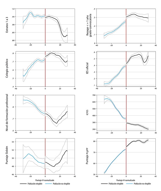 Donde las variables a la derecha ya fueron definidas y corresponde al término de error. Estas regresiones se muestran en el Anexo 2, mientras que las pruebas gráficas de continuidad para el conjunto de covariables seleccionadas según la disponibilidad de la información se sintetizan en la gráfica 8, donde en el eje horizontal se ubica el puntaje normalizado (esto es ubicando el puntaje de corte en cero) y en el vertical el valor de la covariable.
