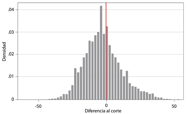 Finalmente, otra condición que requiere esta metodología es que ni los aspirantes ni el administrador del programa puedan manipular la elegibilidad alterando el puntaje. Esto significa que no debería observarse una discontinuidad en la función de densidad alrededor del puntaje de corte normalizado, como se evidencia en la gráfica 11.