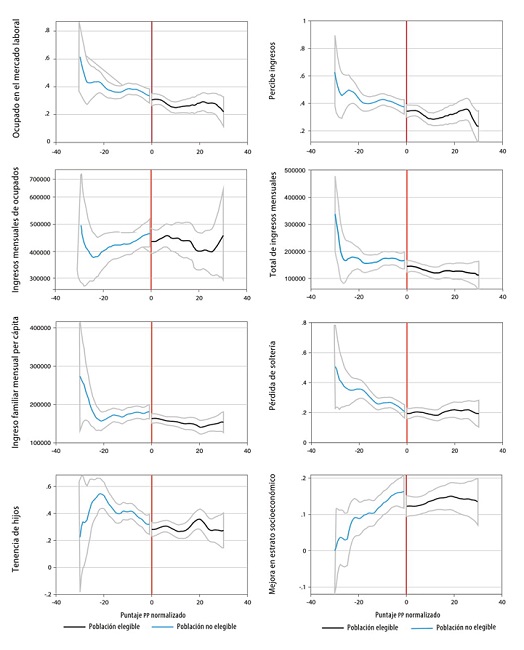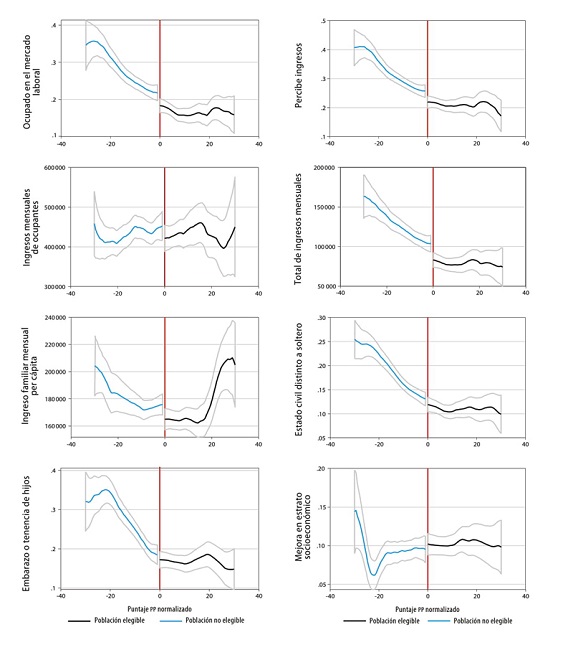 De igual manera, se encontró un efecto positivo en la ocurrencia de embarazo: las mujeres elegibles ubicadas cerca al umbral presentan una menor probabilidad de tener hijos. Asimismo, los elegibles parecen tener más probabilidad de mejorar su estrato socioeconómico y de acceder al sistema educativo superior. No se encontró evidencia con respecto a la pérdida de soltería.
