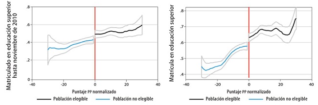 Para validar la continuidad en las variables de control y previendo efectos de PLyPP a largo plazo se seleccionaron de la población tratada y no tratada aquellos inscritos que se postularon al programa hasta 2010:II. La idea que hay detrás es que los programas de pregrado, específicamente las carreras profesionales universitarias tienen en su gran mayoría una duración de cinco años, por lo que en 2010 prácticamente toda la población tratada (al menos la que no haya desertado) ya en esa fecha debió haber culminado sus estudios. En este sentido, puede esperarse la identificación de efectos superiores con esta selección muestral más pequeña.
