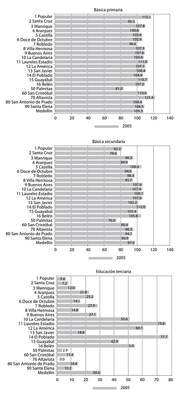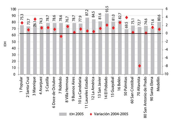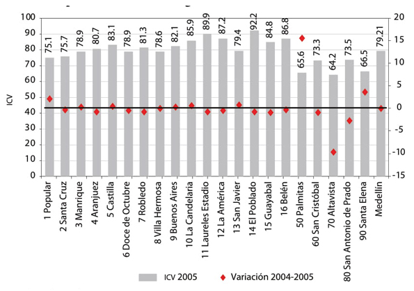 En Medellín se evidenciaban entre 2004 y 2005 notables diferencias entre sus 16 comunas y cinco corregimientos. Las gráficas 1 y 2 registran el Índice de Desarrollo Humano (IDH) y el Índice de Condiciones de Vida (ICV) para la ciudad para 2004 y 2005 por comuna o corregimiento a partir de la Encuesta de Calidad de Vida (ECV) de Medellín.