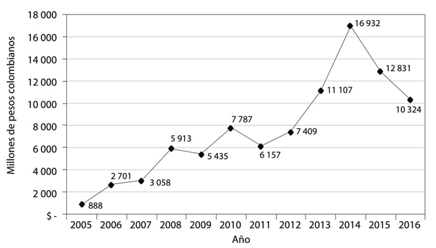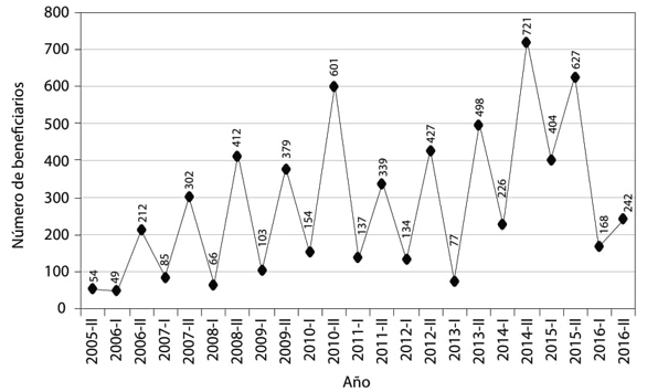 En este sentido, la administración anualmente destina 5 por ciento del presupuesto para que cada uno de los 21 territorios2 que conforman la ciudad prioricen iniciativas sociales de toda índole (salud, cultura, recreación, infraestructura y educación, entre otros) mediante votaciones en cada territorio en donde los ciudadanos eligen los proyectos que para la comunidad consideran prioritaria su ejecución en el año siguiente para resolver alguna necesidad o problemática particular. Los proyectos que en cada territorio tengan el mayor número de votos y puedan financiarse completamente con el recurso asignado por la alcaldía son priorizados y ejecutados en la siguiente vigencia. Entre los proyectos que se consideran a votación, año a año ha estado la financiación de estudios superiores por el lado de la demanda. Es así como entre 2005 y 2016 se han beneficiado más de seis mil jóvenes. La gráfica 5 ilustra la evolución del número de beneficiarios de PLyPP. Con respecto al presupuesto focalizado en esta iniciativa, se han invertido más de noventa mil millones de pesos (gráfica 6).