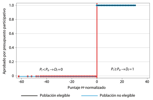 Para estimar el impacto inicial del uso del presupuesto participativo en la financiación de la educación superior en indicadores de educación, estado civil, embarazo y mercado laboral se utiliza la metodología de regresión discontinua (RD). Dicha metodología aprovecha la existencia de un puntaje exógeno que define la elegibilidad para recibir el tratamiento (variable de asignación o running variable).