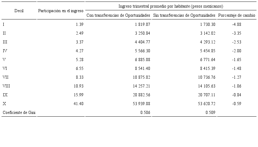 En cuanto a la distribución del ingreso, el decil X concentra 41.4 por ciento del ingreso total de los hogares y el decil I apenas 1.39 por ciento, reflejando una elevada concentración de ingresos en el Índice de Gini. Al ser extraídos de la economía mexicana los fondos provenientes de las transferencias del Programa Oportunidades, la desigualdad del ingreso queda prácticamente en el mismo nivel presentado antes del cambio, es decir, la economía mexicana bajo el esquema de transferencias del Programa Oportunidades y sin éstas sigue presentando los mismos índices de desigualdad y refleja un entorno de inequidad relevante.