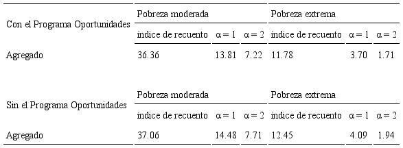 Estos resultados ponen en duda el cumplimiento del propósito redistributivo del programa, ya que como muestra el Índice de Gini, el nivel de desigualdad queda bajo las mismas proporciones del panorama con transferencias y los tres primeros deciles representan apenas 7.25 por ciento del total de ingresos de la población. En cuanto a los índices de pobreza, a pesar de que éstos disminuyen con las transferencias, lo hacen en menos de uno por ciento, poco proporcional a la importancia dada por el gobierno nacional a este tipo de políticas sociales, los montos invertidos y los altos índices de pobreza presentados. A pesar de que las transferencias provenientes del Programa Oportunidades como parte importante de la política social para el combate a la pobreza del gobierno federal parecen no generar un impacto positivo en la redistribución del ingreso, los resultados presentados muestran que en ausencia de éstos, aumentaría el número de personas en pobreza tanto extrema como moderada, la brecha se haría aún más amplia y la severidad de la pobreza se agudizaría más, además de que el output total de la economía se vería disminuido.
