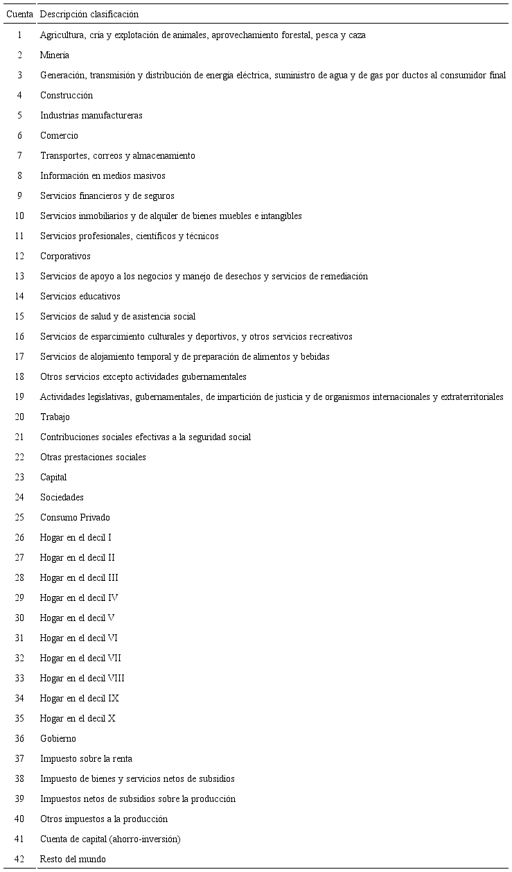 Esta MCS considera 35 cuentas endógenas y siete cuentas exógenas. Las cuentas endógenas corresponden a las actividades productivas, remuneraciones a los factores productivos (trabajo y capital), sociedades y los hogares ya que se busca explicar los efectos sobre los niveles de pobreza y desigualdad ante una inyección exógena del gasto público (gobierno para el caso de esta investigación a través de las transferencias en efectivo a los hogares pobres), a través de un aumento de demanda de capital (cuenta de capital) o de demanda de exportaciones (cuenta resto del mundo). Estas últimas, respectivamente, corresponden a las cuentas exógenas siguiendo a Cardenete y Delgado (2011).