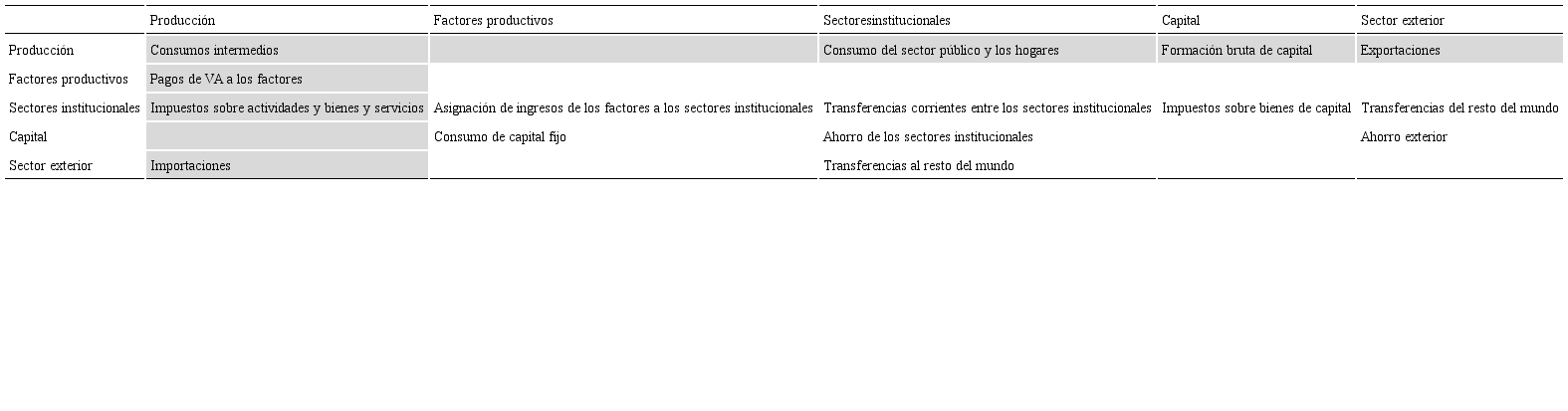 El cuadro 2 muestra el esquema de una MCS. En ésta, los ingresos obtenidos por ventas de bienes y servicios producen remuneraciones para actividades y factores productivos. Estos ingresos forman el valor añadido que se distribuye hacia los sectores institucionales que a su vez los destinan para gasto o ahorro de sectores productivos o hacia ellos mismos, con lo que se generan nuevas rentas y se comienza un nuevo ciclo.