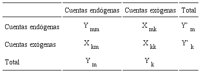 De esta manera, Ymm es una matriz que contiene las relaciones entre cuentas endógenas; Xkm contiene las relaciones entre cuentas endógenas y exógenas; Xmk representa los shocks de las cuentas exógenas en las endógenas; Xkk contiene sólo las relaciones entre cuentas exógenas. Los totales quedarán conformados de la siguiente manera: Ym y Yk son matrices columna que totalizan los ingresos y gastos de las cuentas endógenas y, Y’m y Y’k son matrices fila que totalizan los gastos de las cuentas endógenas y de las cuentas exógenas respectivamente.
