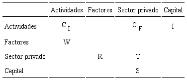 Donde, CI es la matriz insumo-producto de coeficientes técnicos; W es la matriz de coeficientes de retribución a los propietarios de los factores provenientes de los sectores productivos; R es la matriz de coeficientes de distribución de los ingresos que se generan durante todo el proceso productivo provenientes de los factores de producción hacia las instituciones privadas; CF es la matriz de propensiones medias al consumo; T son los coeficientes de transferencias entre los sectores; S son las propensiones al ahorro; I son los coeficientes de inversión.