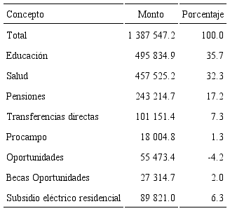 Para analizar el impacto económico del Programa Oportunidades en México a través de la eliminación de las transferencias recibidas por los hogares, que para el año 2012 fue de 56 mil millones de pesos (3 mil millones USD), primero se construye un vector partiendo del monto asignado por el gobierno federal, definido en el gasto público para 2012 de acuerdo con la Secretaría de Hacienda y Crédito Público (SHCP, 2012) mostrado en el cuadro 5.