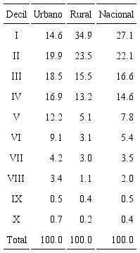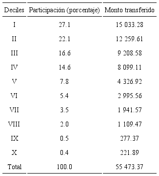 El monto total transferido se reparte entre los hogares, de acuerdo con la distribución porcentual de las transferencias monetarias (cuadro 6). Se observa que los primeros tres deciles de ingreso concentran alrededor de 66 por ciento del total.