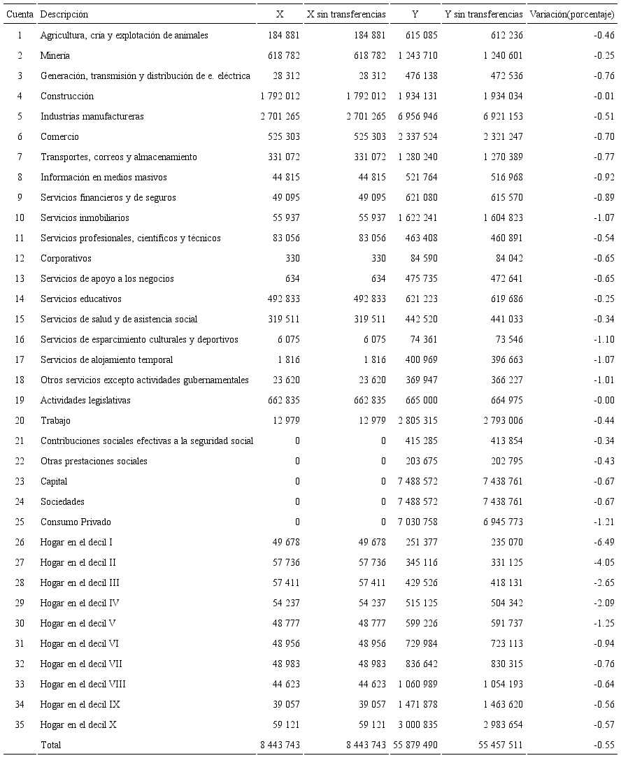 Para conocer el efecto en la economía, se crea un nuevo vector que consiste en sustraer al vector Xm las inyecciones recibidas por los hogares desagregados en deciles de ingreso y otorgadas por el gobierno federal. Seguidamente, se procede a clasificar las cuentas de la MCS-MX08 en endógenas y exógenas. En el caso de este estudio, se escoge al gobierno como cuenta exógena que representa las transferencias a los hogares por parte del Programa Oportu nidades.