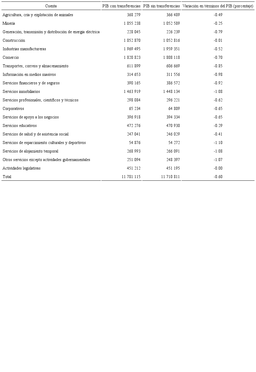 Por otro lado, los sectores menos afectados por la eliminación de las transferencias monetarias son las actividades legislativas y la construcción con 0.01 por ciento de variación, la minería con 0.25 por ciento, los servicios educativos con una variación de 0.25 por ciento y los servicios de salud con 0.34 por ciento.