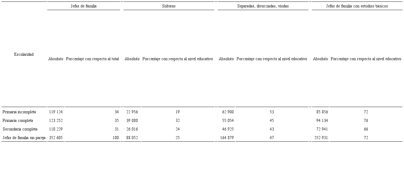 De las jefas de familia sin pareja 72 por ciento sólo cuentan con un nivel de escolaridad básico, reconociendo que la mayoría de las solteras sólo tienen la primaria completa y más de la mitad de las que están separadas, divorciadas o viudas no terminaron la escuela. Esta situación incrementa la vulnerabilidad debido a que los bajos niveles de educación limitan las oportunidades laborales de las jefas de familia.
