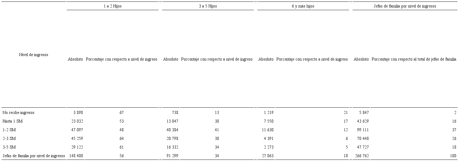 De acuerdo con la ENOE, durante el cuatro trimestre del año 2013 había 222 762 mujeres solas o que alguna vez estuvieron unidas y que tenía más de un hijo, las cuales dadas estas características pueden ser consideras jefas de familias. De manera general se observa que 37 por ciento de este grupo de población percibe entre uno y dos salarios mínimos (SM) y 26 por ciento percibe entre dos y tres SM; al sumarlos se reconoce que 64 por ciento de las jefas de familia perciben entre uno y tres SM. Durante el año 2013 el SM se ubicó en 63.07 pesos,1 por lo tanto estas jefas de familia recibieron entre 1 891.2 y 5 676.3 pesos mensuales; mientras que la línea de bienestar mínimo correspondiente a la canasta básica en el mismo periodo fue de 1 186.55 pesos y la línea de bienestar relacionada con las necesidades alimentarias y no alimentarias fue de 2 444.68 pesos mensuales.