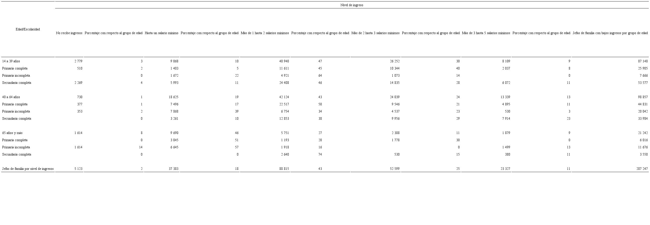 Sin embargo, al incorporar el filtro de la escolaridad y agrupar la edad se observa que hay 207 247 jefas de familia que tienen más de un hijo y que ganan hasta cinco SM o no reciben remuneración y se reconoce que la mayoría de ellas ganan entre uno y dos SM, lo que significa un ingreso de 3 784.2 pesos mensuales. El fac tor de escolaridad muestra una diferencia en los ingresos de las jefas de familia, así se observa que 11 por ciento de las jefas de familia que tienen entre 40 y 64 años ganan entre tres y cinco SM, sin embargo el porcentaje de aquellas que tienen secundaria completa se incrementa a 23 por ciento. El caso más claro de la relación lo muestran las adultas mayores, ya que el mayor porcentaje de éstas que tienen primaria completa o incompleta ganan hasta un SM, sin embargo el mayor porcentaje de las jefas de familia que tienen más de 65 años y cuentan con la secundaria terminada ganan entre uno y dos SM.
