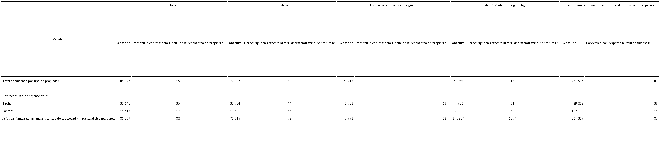 Al considerar la propiedad de las viviendas como el principal activo material que pueden poseer las jefas de familia, se reconoce que 45 por ciento de éstas son rentadas y de forma general 231 596 jefas de familia viven en una casa rentada, prestada, propia pero están pagando e intestada o en algún litigio legal. Esta situación vuelve vulnerable a este grupo de población, ya que ante cambios en el contexto económico su posibilidad de acceso a la vivienda está en riesgo. Se reconoce que estas viviendas requieren reparaciones, como se observa en el cuadro 5, 87 por ciento de las viviendas que habitan las jefas de familia que no son de su propiedad requieren una reparación, ya sea en el techo o las paredes, mientras que 98 por ciento de las viviendas prestadas se encuentran en esta situación.