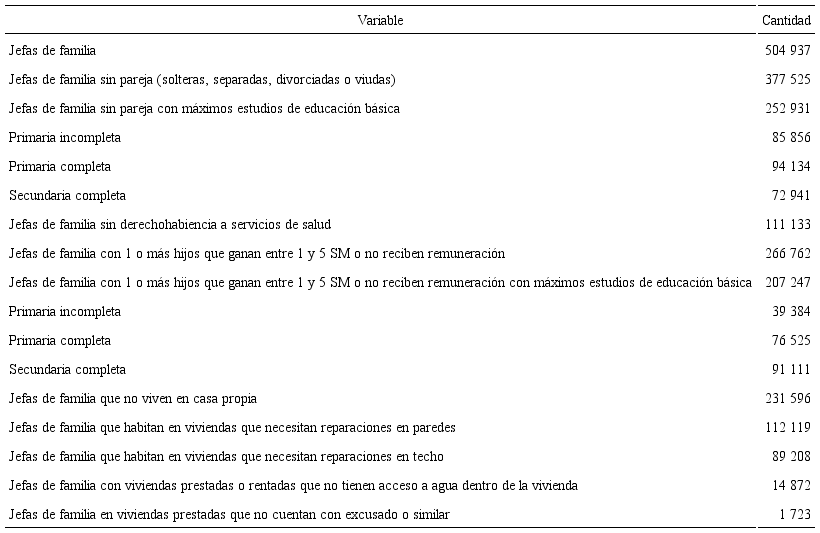 Específicamente, del poco más de medio millón de jefas de familia las cifras muestran que las jefas de familia vulnerables superan a la población objetivo señalada en el diagnóstico gubernamental, considerando inicialmente que hay 252 931 jefas de familia que viven solas (solteras, separadas, divorciadas o viudas) y cuyos estudios no rebasan la secundaria completa; por el lado de los ingresos se reconoce que hay 207 247 jefas de familia que no reciben ingresos u obtienen máximo cinco salarios mínimos y tienen escolaridad básica, demostrando que la cifra de jefas de familia vulnerables, ya sea por carencias o ingresos duplica los 101 463 hogares con jefatura femenina identificados en situación de pobreza multidimensional.