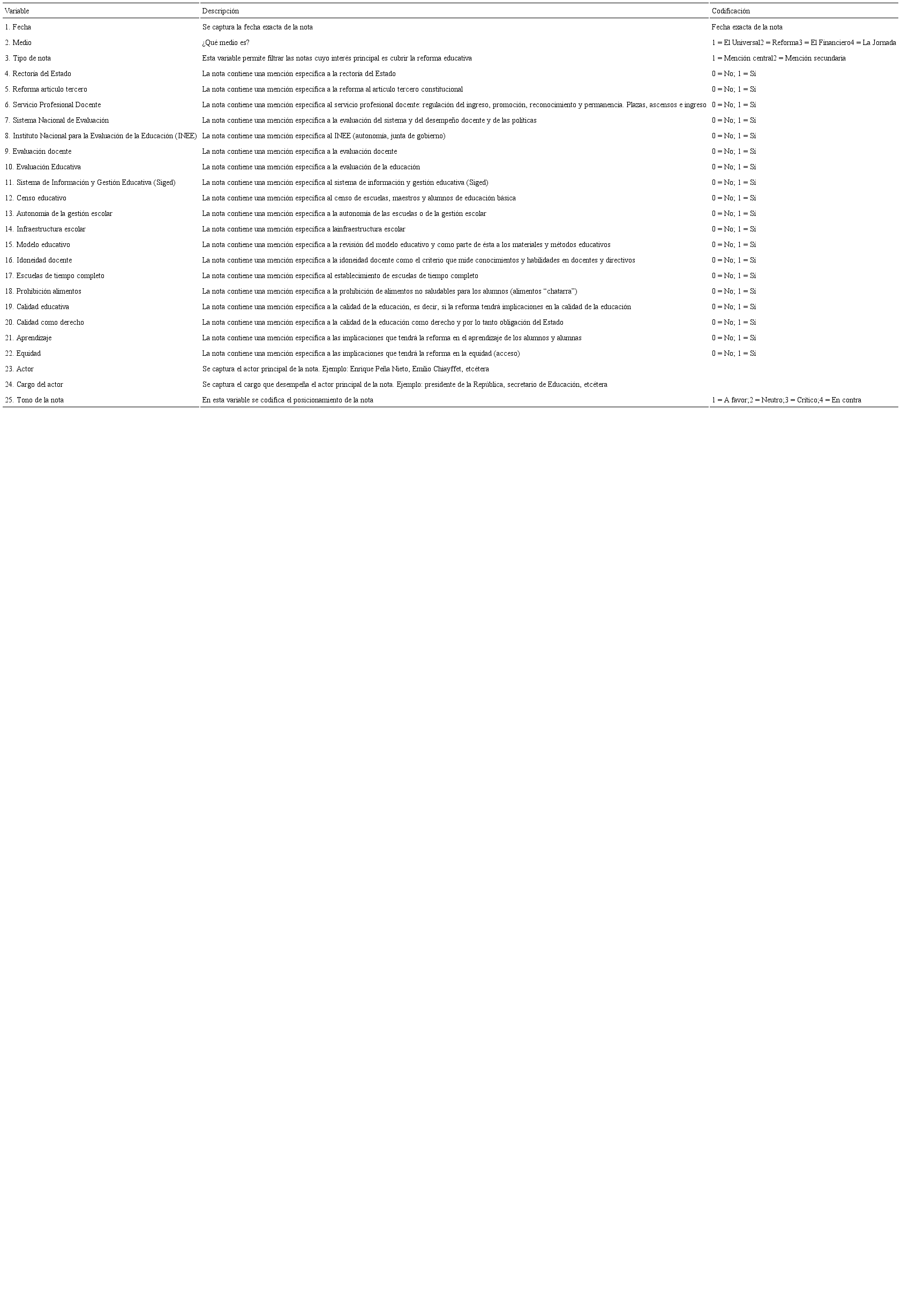 Se construyó una base de datos original donde se analizaron 19 variables que se describen en el cuadro 1. Estas variables fueron codificadas en términos de ausencia o presencia del atributo en cada nota. Las variables 1 y 2 (fecha y medio) son para identificación de la nota. La variable 3 denominada “tipo de nota” se utilizó como una variable de filtro que permitió elegir aquellas notas cuyo contenido global se refiere específicamente a la reforma educativa. Dado que se utilizó un buscador de noticias, se utilizó el término “reforma educativa” para obtener la totalidad de las notas, sin embargo, se encontraron un buen número de notas que contenían alguna mención a la reforma educativa en el marco de otros temas, por ejemplo, cuando se hablaba de un paquete de reformas, incluida la educativa. Estas notas no entraron en el análisis, dado que la cobertura de la reforma educativa no era el interés principal.