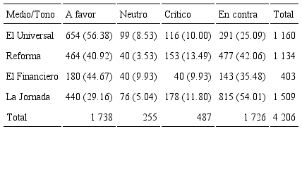 Se encontró que los posicionamientos dan lugar a un ambiente de polarización en la agenda política de los medios. En este sentido, se encontraron diferencias importantes por periódico. El cuadro 3 muestra que del total de notas del periódico El Universal, 56.3 por ciento fueron notas a favor y 25 por ciento en contra. Lo contrario sucede con La Jornada, donde los porcentajes se invierten (29.16% de notas a favor y 54% en contra). Los periódicos Reforma y El Financiero mantuvieron un cierto equilibrio entre el porcentaje de notas a favor y en contra, destacando particularmente Reforma, donde el porcentaje de notas a favor y en contra es bastante similar (cuadro 3). Encontramos que del total de notas que focalizaron su atención en la RE (4 206), 41 por ciento publicó notas que reflejan un total rechazo y 41.3 por ciento una posición favorable.