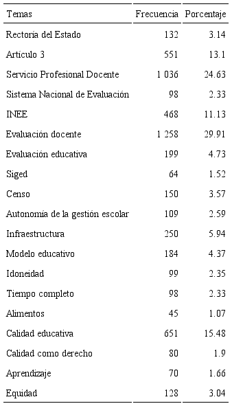 La RE y sus leyes secundarias destacaron por introducir un conjunto de decisiones y acciones que dieron lugar a importantes cambios no incrementales en el sistema educativo mexicano. Destaca que la evaluación docente y el Servicio Profesional Docente fueron los temas más mencionados por los periódicos analizados con 29.9 y 24.63 por ciento, respectivamente. La calidad educativa y el INEE fueron los siguientes temas más mencionados en las notas con 15.5 y 11.13 por ciento, respectivamente. Si se agrupan todos los temas relacionados con evaluación (SPD, SNEE, INEE, evaluación docente, evaluación educativa) se tiene que la cobertura alcanzó 72.6 por ciento, lo que permite afirmar que la atención mediática estuvo centrada principalmente en la evaluación. Los temas restantes recibieron una cobertura de apenas entre uno y 6 por ciento, es decir, estuvieron prácticamente ausentes en la cobertura, tal es el caso de la rectoría del Estado y la calidad como derecho, que fueron dos de los cambios sustanciales de esta reforma (cuadro 4).